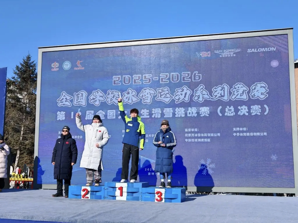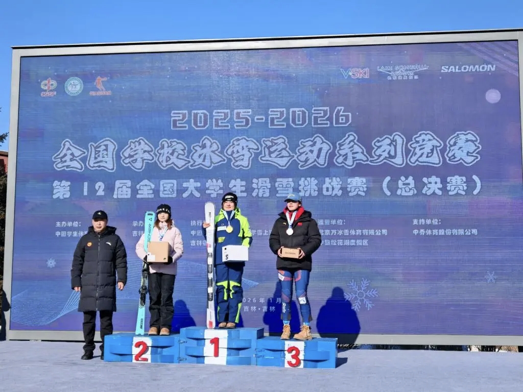 在高山大回转女子个人赛中,2023级冰雪专业学子张羽全程零失误完成滑行,成功斩获该项目冠军,更凭借出色表现荣获赛会颁发的“全场最佳运动员”荣誉称号。