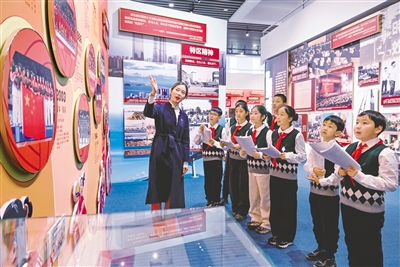 1月19日,小宣讲员在展厅内进行实训。当日,内蒙古展览馆“小小宣讲员”寒假集训营如约而至,活动将持续至1月24日。作为该馆的品牌社会教育活动,“小小宣讲员”培训班自2016年启动以来,已累计吸引近4000名学生参与,让孩子们在学习普通话、体验非遗技艺、讲解经典故事的过程中拓宽视野、增长见识。