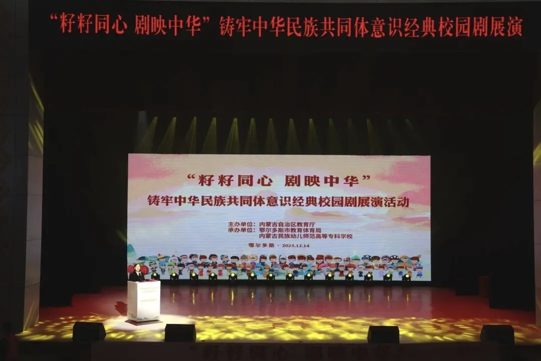 为深入贯彻落实习近平总书记关于加强和改进民族工作的重要思想,持续深化铸牢中华民族共同体意识教育改革,着力打造校园文化原创精品,12月14日,由内蒙古自治区教育厅主办,鄂尔多斯市教育体育局、内蒙古民族幼儿师范高等专科学校承办的“籽籽同心 剧映中华”铸牢中华民族共同体意识经典校园剧展演活动举办。来自12个盟市的13部优秀作品齐聚“暖城”鄂尔多斯,各剧目以舞台艺术为纽带,生动展现了各民族交往交流交融、团结奋进的时代风貌,奏响了中华民族一家亲的和谐乐章。