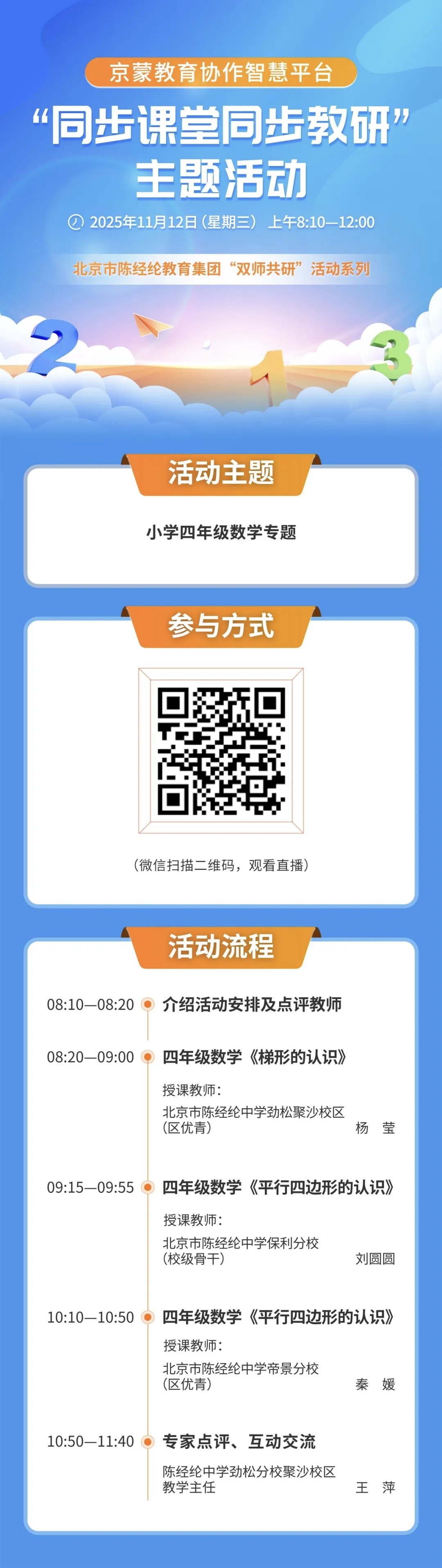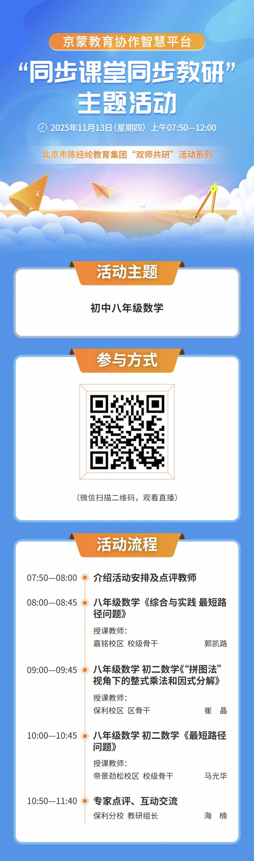 11月12-14日将开展小学四年级数学专题,初中八年级数学专题,小学北京市骨干教师专场共3场活动,点击下方活动图片,即可查看活动具体安排和直播二维码,期待您的关注与参与!