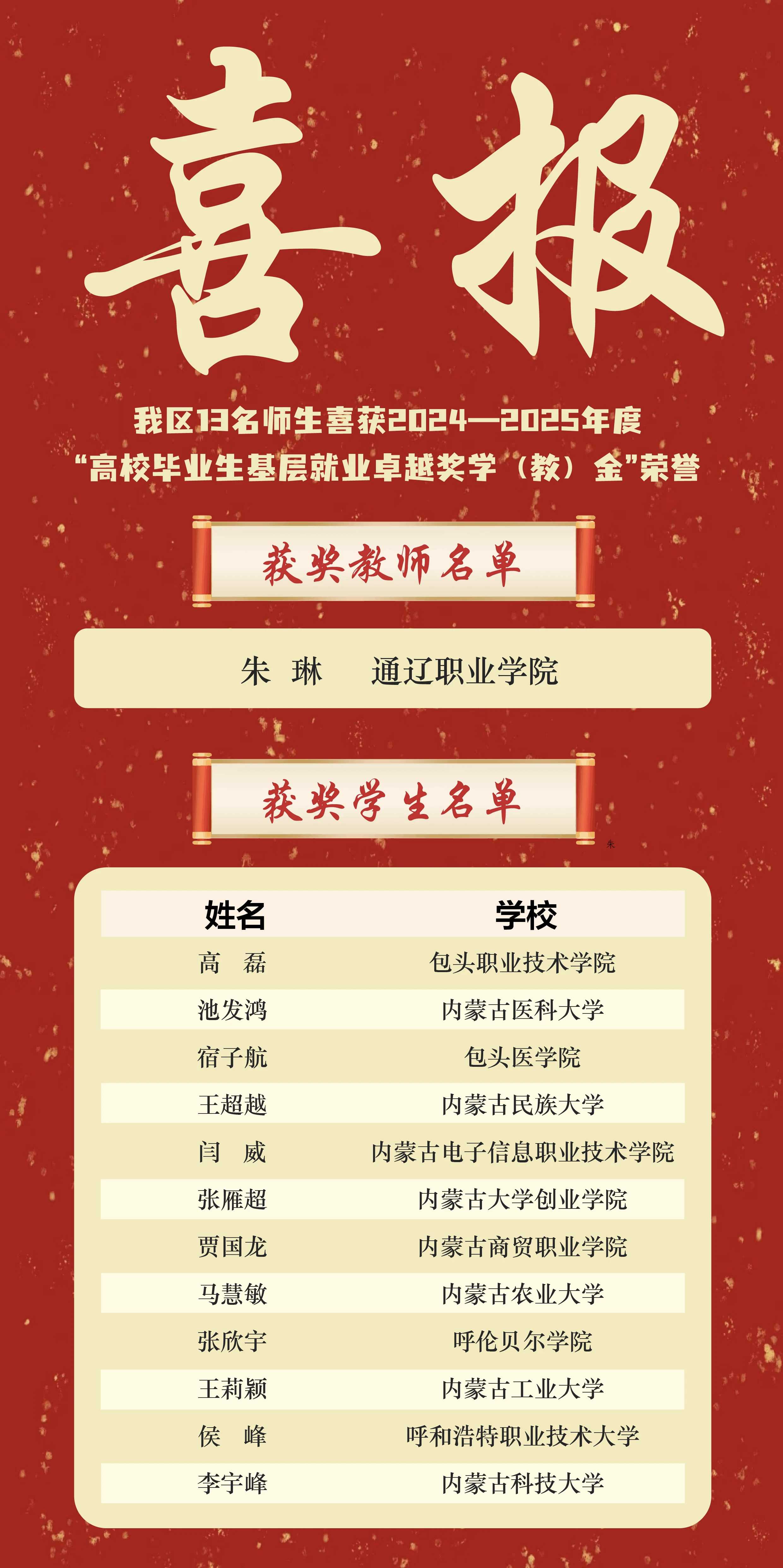 近日,教育部高校学生司(高校毕业生就业服务司)公布“高校2024-2025年度“高校毕业生基层就业卓越奖学(教)金”获奖名单,我区通辽职业学院教师朱琳、包头职业技术学院毕业生高磊等13名师生获此殊荣。